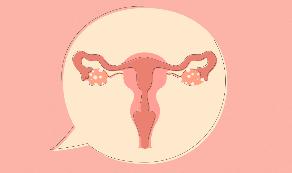 An illustration of a uterus with tiny cysts on the ovaries to show it's affected by PCOS